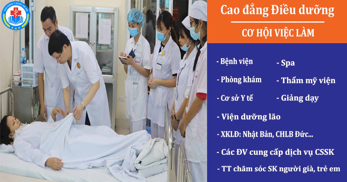 Cơ hội việc làm cho sinh viên tốt nghiệp ngành Điều dưỡng là rất rộng mở. Tốt nghiệp ngành Điều dưỡng tại trường Cao đẳng Y Dược Hà Nội bạn có thể làm việc tại các bệnh viện, phòng khám, các cơ sở Y tế, trung tâm chăm sóc sức khỏe người già, trẻ em, viện dưỡng lão, các đơn vị cung cấp dịch vụ chăm sóc sức khỏe, spa, thẩm mỹ viện…