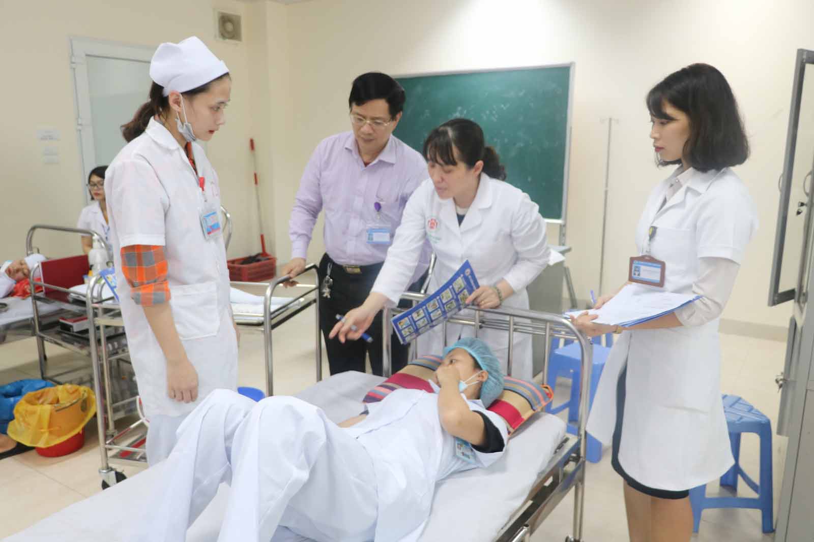 Cán bộ Điều dưỡng Bệnh viện Trung ương Quân đội 108 hướng dẫn sinh viên ngành Điều dưỡng Trường Cao đẳng Y Dược Hà Nội thực hành