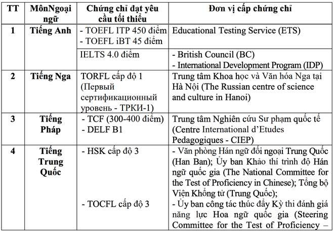 Bộ GD&ĐT quy định thí sinh có một trong các chứng chỉ ngoại ngữ (giống hoặc khác với môn ngoại ngữ đang học tại trường phổ thông) hợp lệ, có giá trị sử dụng ít nhất đến ngày 27/6/2023 và đạt mức điểm tối thiểu theo quy định được miễn thi bài thi ngoại ngữ trong xét công nhận tốt nghiệp THPT năm 2023. Cụ thể như sau: