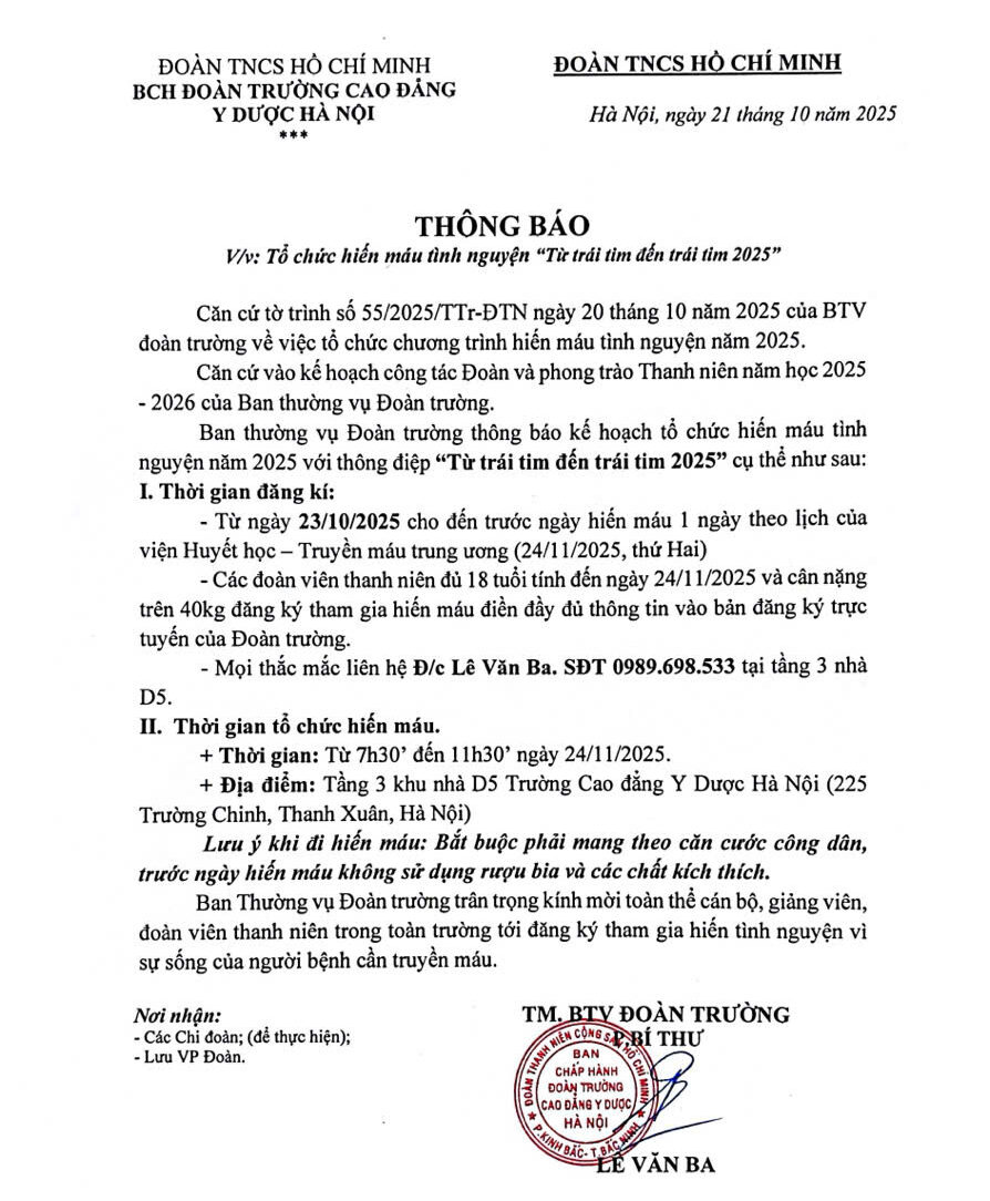 Ban Thường vụ Đoàn Trường kêu gọi toàn thể cán bộ, giảng viên, đoàn viên, thanh niên cùng chung tay tham gia hiến máu – hành động nhỏ nhưng mang ý nghĩa lớn, góp phần chia sẻ sự sống và lan tỏa yêu thương “Từ trái tim đến trái tim”.